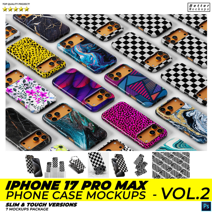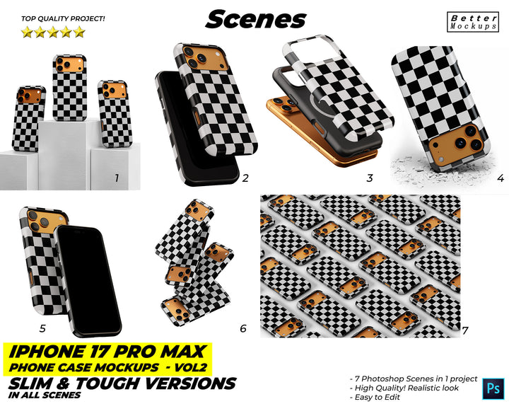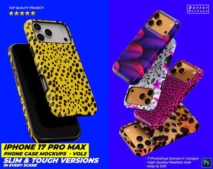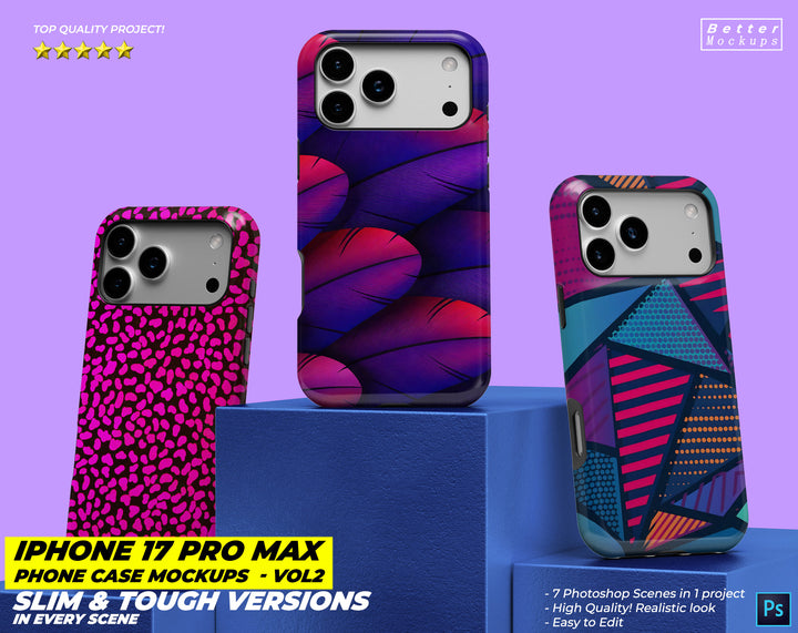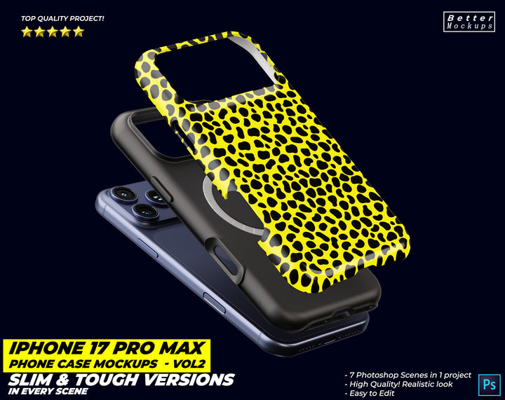 New images for iPhone 17 Pro Max Phone Case Mockups – For Tough & Snap (Slim) Cases - 7 mockup scenes in one project.