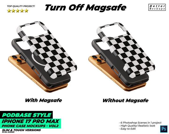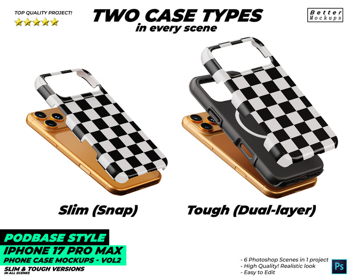 In this project, you will find iPhone 17 Pro Max Tough & Snap(Slim) Case Mockups in Podbase style.