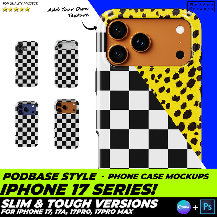 Podbase Style iPhone 17 Series Slim Tough Phone Case Front Mockups