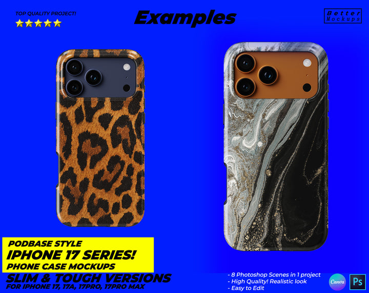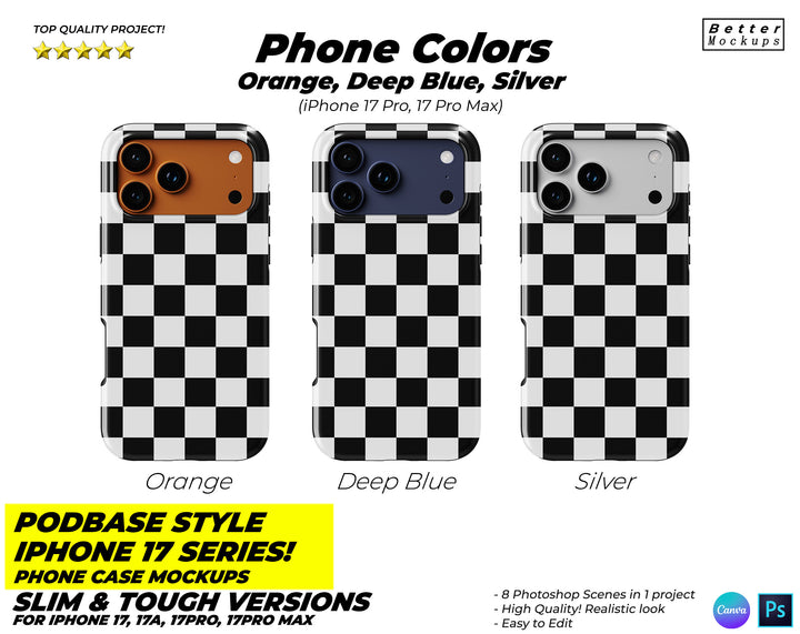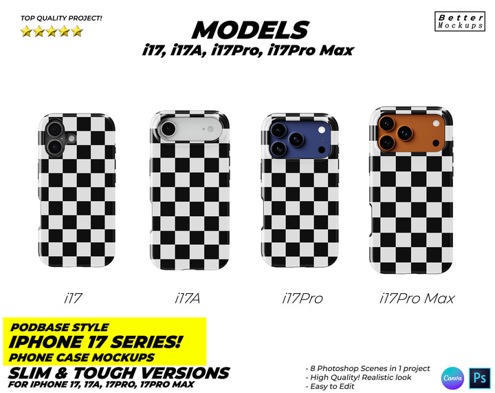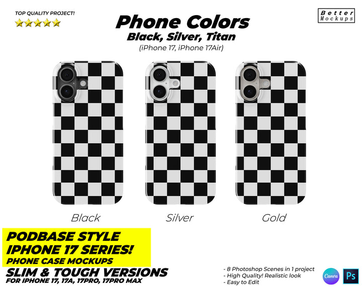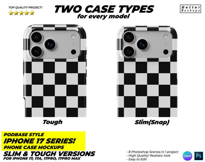This iPhone 17 mockup pack is ideal for sellers and designers working with print-on-demand platforms like Podbase, Printify, Printful, Gelato, and Casestry. Whether you're creating designs for the iPhone 17, iPhone 17 Air, iPhone 17 Pro, or iPhone 17 Pro Max, these mockups are perfect for showcasing Snap (Slim) and Tough case styles in a professional, polished way.