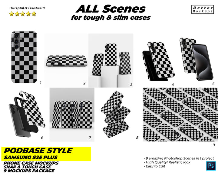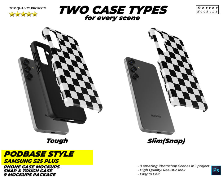 In this project, you will find Samsung S25 Plus Tough & Snap(Slim) Case Mockups in Podbase style.